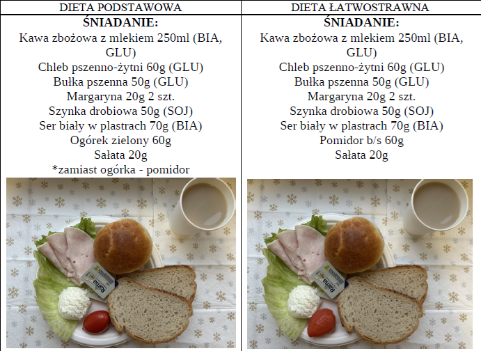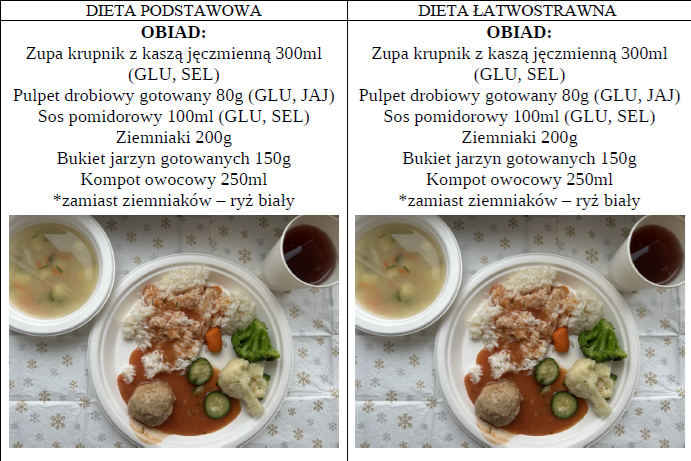 Zdjęcia i opis pozycji z jadłospisu dwóch posiłków z dwóch diet najczęściej występujących dnia 02