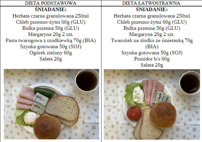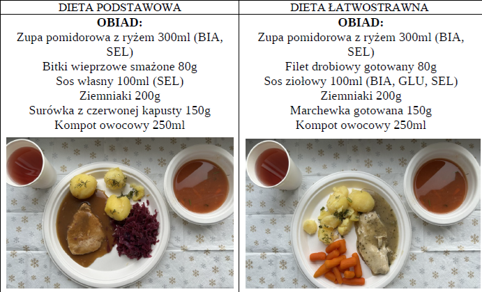 Zdjęcia i opis pozycji z jadłospisu dwóch posiłków z dwóch diet najczęściej występujących dnia 03