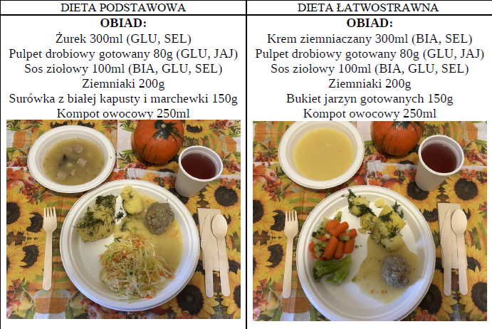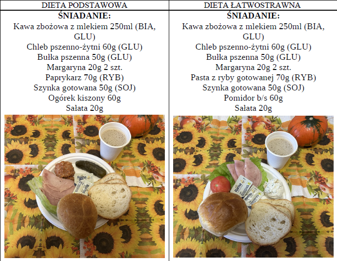 Zdjęcia i opis pozycji z jadłospisu dwóch posiłków z dwóch diet najczęściej występujących dnia 04