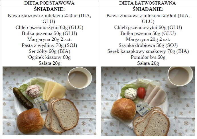 Zdjęcia i opis pozycji z jadłospisu dwóch posiłków z dwóch diet najczęściej występujących dnia 04