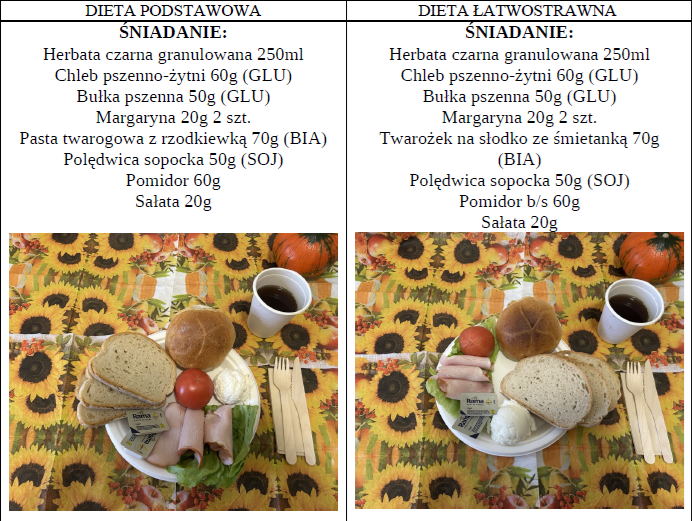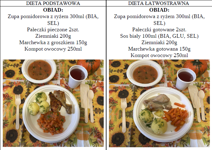 Zdjęcia i opis pozycji z jadłospisu dwóch posiłków z dwóch diet najczęściej występujących dnia 05