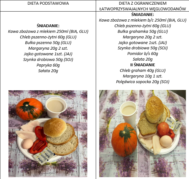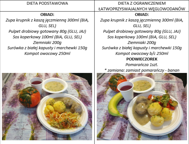 Zdjęcia i opis pozycji z jadłospisu dwóch posiłków z dwóch diet najczęściej występujących dnia 14