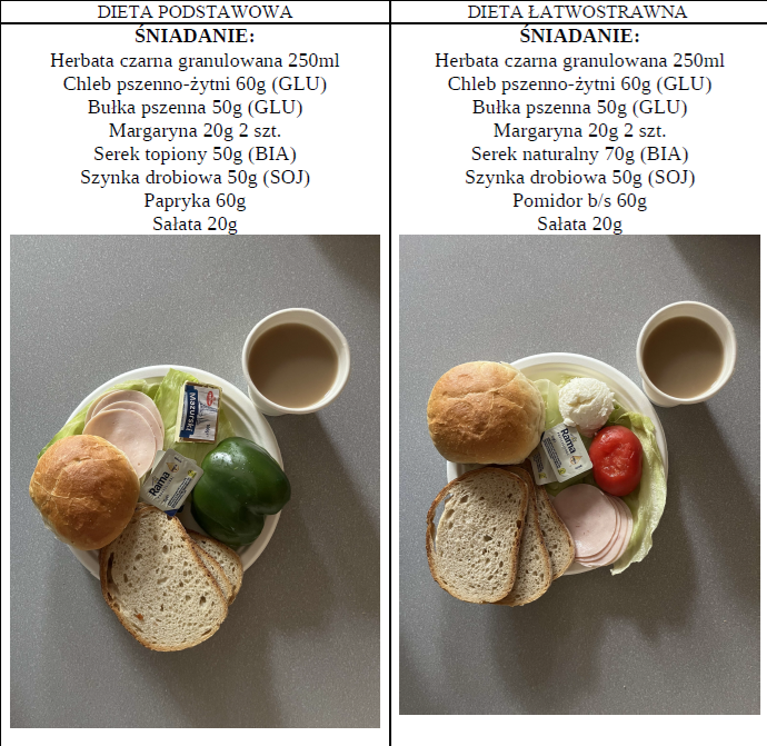 Zdjęcia i opis pozycji z jadłospisu dwóch posiłków z dwóch diet najczęściej występujących dnia 16.04