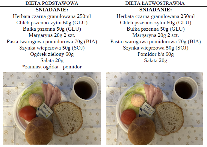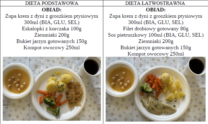 Zdjęcia i opis pozycji z jadłospisu dwóch posiłków z dwóch diet najczęściej występujących dnia 17
