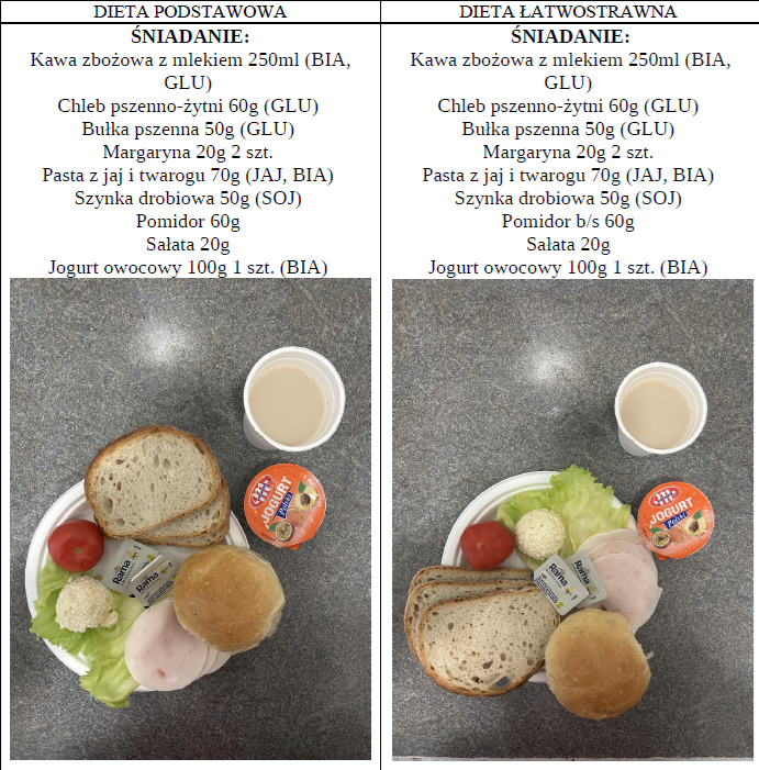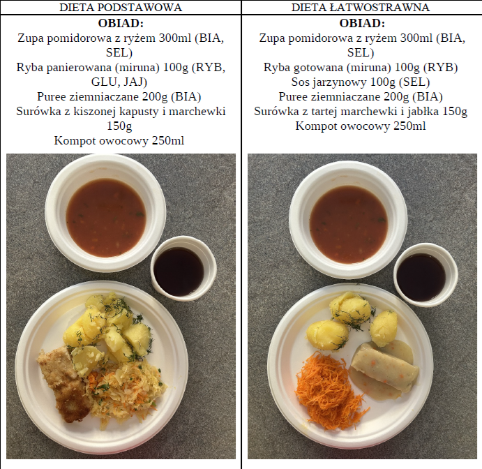 Zdjęcia i opis pozycji z jadłospisu dwóch posiłków z dwóch diet najczęściej występujących dnia 19