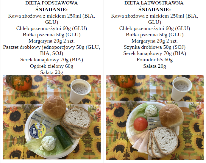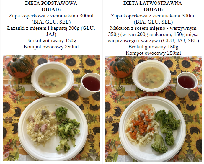 Zdjęcia i opis pozycji z jadłospisu dwóch posiłków z dwóch diet najczęściej występujących dnia 23