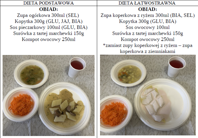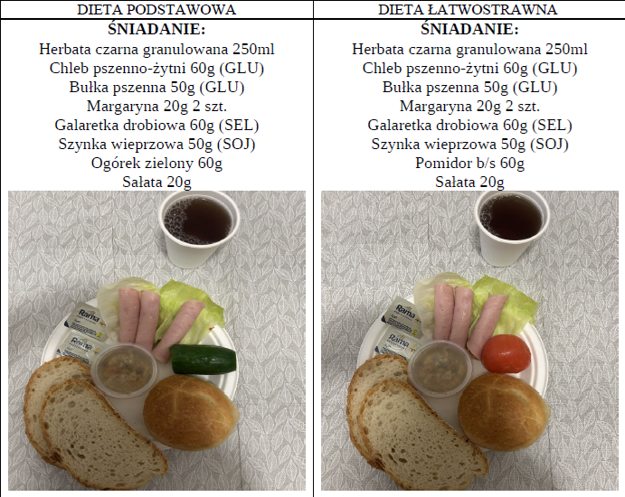 Zdjęcia i opis pozycji z jadłospisu dwóch posiłków z dwóch diet najczęściej występujących dnia 24