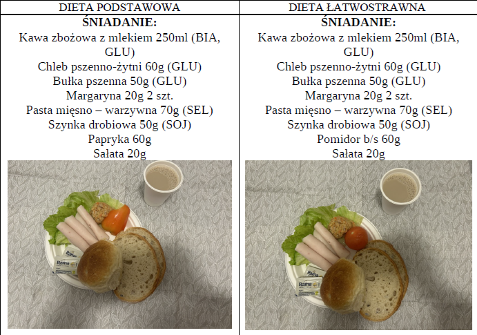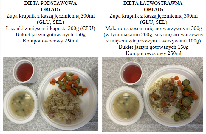Zdjęcia i opis pozycji z jadłospisu dwóch posiłków z dwóch diet najczęściej występujących dnia 25
