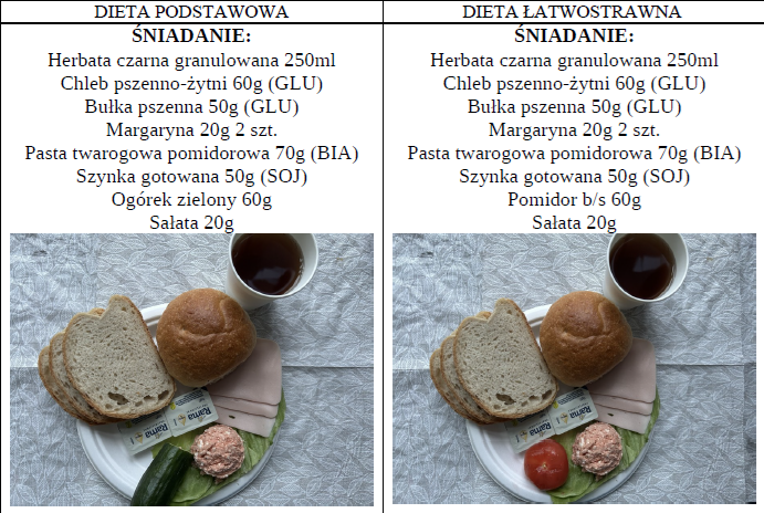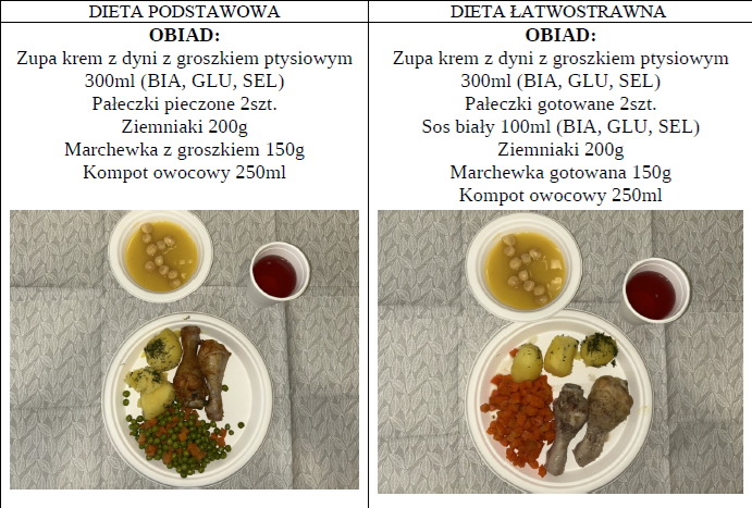 Zdjęcia i opis pozycji z jadłospisu dwóch posiłków z dwóch diet najczęściej występujących dnia 26