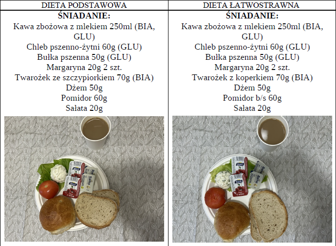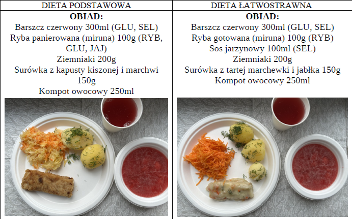 Zdjęcia i opis pozycji z jadłospisu dwóch posiłków z dwóch diet najczęściej występujących dnia 28