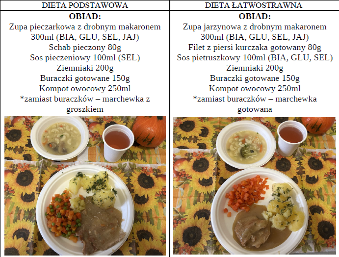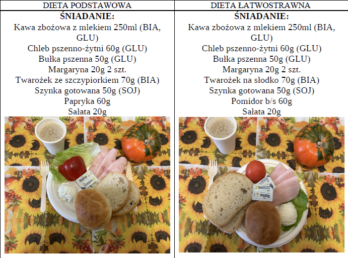 Zdjęcia i opis pozycji z jadłospisu dwóch posiłków z dwóch diet najczęściej występujących dnia 29