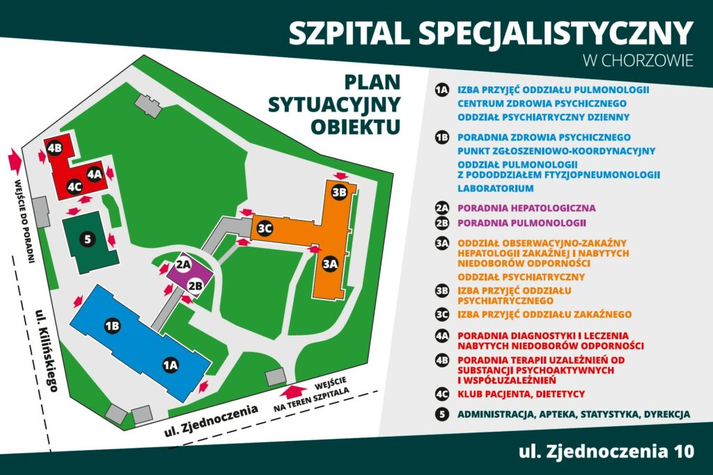 Na kompleks szpitalny Szpitala Specjalistycznego w Chorzowie składa się 5 budynków oraz portiernia, oznaczonych według dołączonego planu: